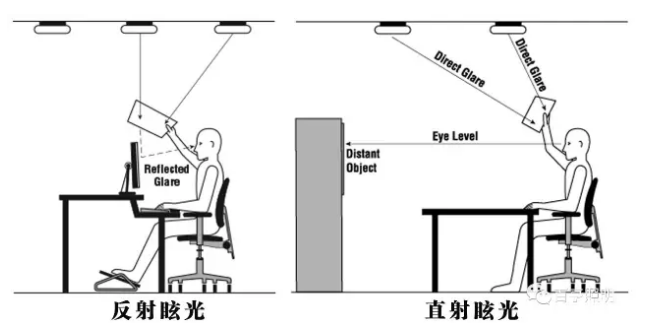 办公室层高普遍在2.5m~3.2m,很容易在计算机显示屏幕上形成干扰眩光,导致降低工作效率,引起疲劳感,我们可以通过增加周边环境的亮度或降低光源的亮度,或者两者同时进行,可采用以下降低对比的方法:
