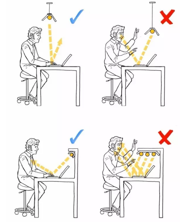 办公区是进行视觉作业的场所,白领一族大多的时间都呆在办公室里,所以在灯光照明上一定要注意,特别是要注意眩光。较暗的物体表面上或者观察者视野里出现明亮的光源,即是眩光,它对员工的伤害极大,眩光是在办公环境里我们不希望看到的,它一般分为直接眩光(灯具直射)、间接性反射(显示器、桌面)眩光。