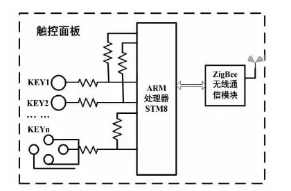 触控面板的硬件电路设计基于新一代ARM处理器STM8S来实现,STM8S系列处理器自带触摸软件库的设计,利用电容本身具有的电荷转移特性,可以实现电容式的触摸传感检测。