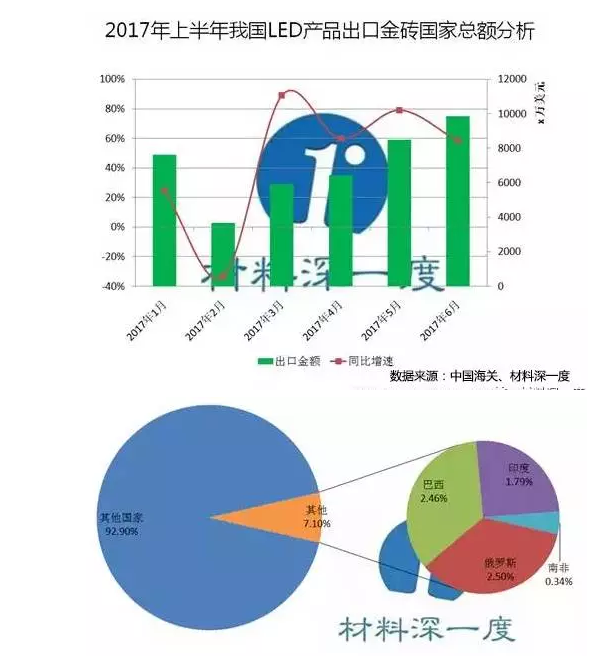 2017年上半年,我国LED照明产品出口的金砖国家总额超过4亿美元,同比增长41.22%,占我国LED照明产品出口比例为7.1%。按出口金额由大到小排名依次是:俄罗斯、巴西、印度和南非。