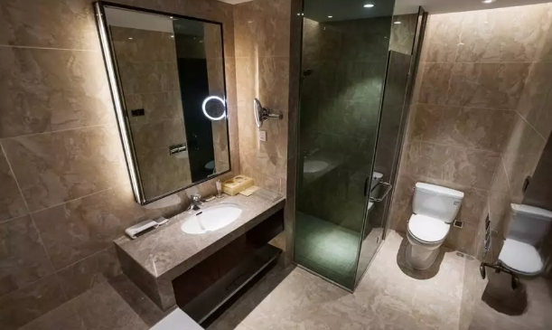 客房卫生间需要宽敞明亮的灯光来营造干净整洁大气的氛围,适合用较高色温,打在洗手台的灯光避免人脸被遮挡而产生阴影。