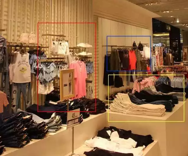 正挂的服饰有亮有暗(红框与蓝框),而中岛的位置(黄框)却没有灯光的照亮。
