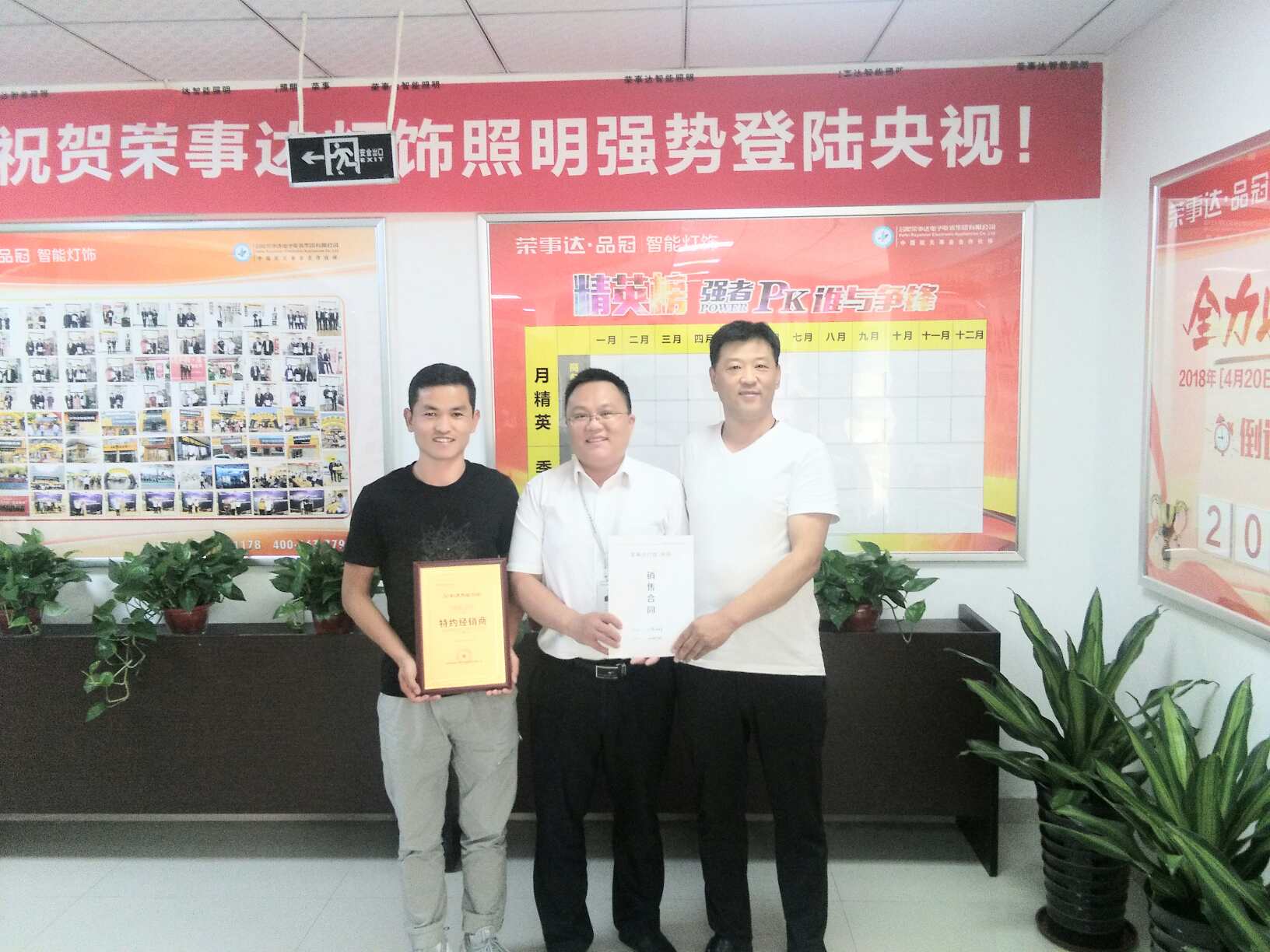 6月签约不断, 荣事达灯饰照明的加盟签约商来访不断。祝贺来自山东潍坊安丘市郑总成功签约荣事达灯饰照明,成为我们的经销商!在此也预祝郑总生意兴隆,财源广进。
