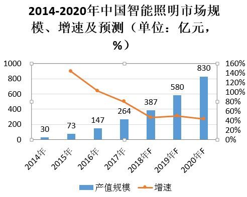 谈起智能照明,目前消费者的接受度普遍有所提升。众多新应用市场中,智能照明仍处于高速成长阶段。GGII数据显示,2017年中国智能照明市场规模达到264亿元,GGII预计2018年智能照明市场规模将达387亿元,同比增长46.6%。
