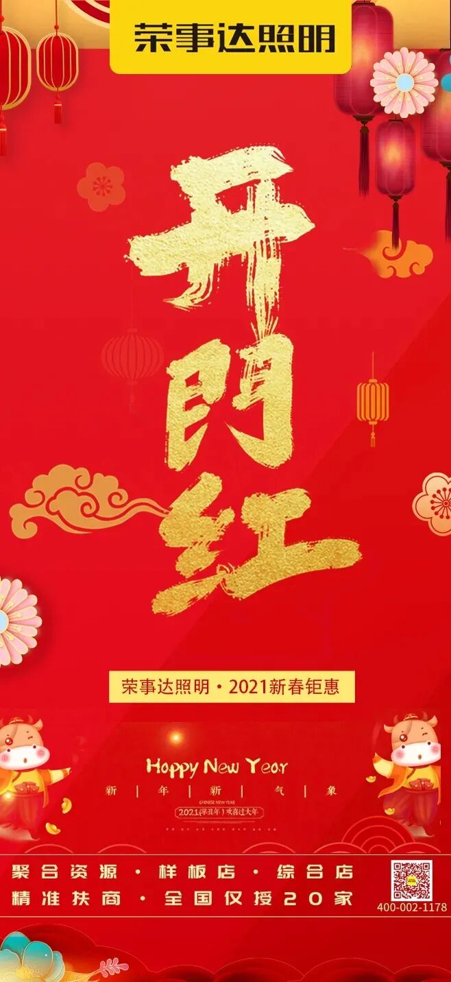 2021年,荣事达照明再出发,我们将继续携手全国经销商,克服一切困难,砥砺前行,特在牛年来临之际,牛气迸发,扭转乾坤,打响新春第一响,【新春钜惠·开门红政策】正火热进行中……期待您的加盟!
