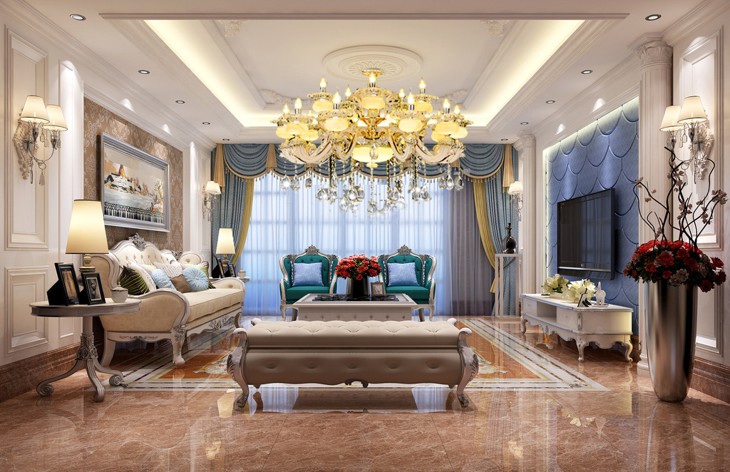 客厅:散光+重点照明,吊灯造型应考究