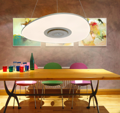 荣事达“飞天”空气净化智能灯中的吊灯系列,体型纤薄,现代简约,多种灯体形状可选。灯具的控制方式包括供电开关分段切换,手势挥动,无线遥控器和移动平台应用等,通过RGB辅助提示灯环可以便捷的观察到空气质量水平和空气净化单元工作状态,通过APP无论在何时何地都详细的可以查看当前空气质量检测数值和历史曲线。