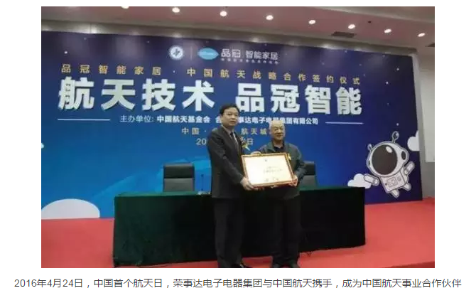 荣事达作为一个有着极高民族自豪感和社会责任感的企业,一直以航天精神为指引,不断接轨国际标准。能够助力中国航天事业发展,和体现国家实力的伟大事业结合在一起,是我们的荣幸,更是一份义不容辞的责任、一种难得的机遇和挑战。正如我国航天事业走在世界前列一样,荣事达也将面向国际,成为中国智能家居国际化的先行者。”